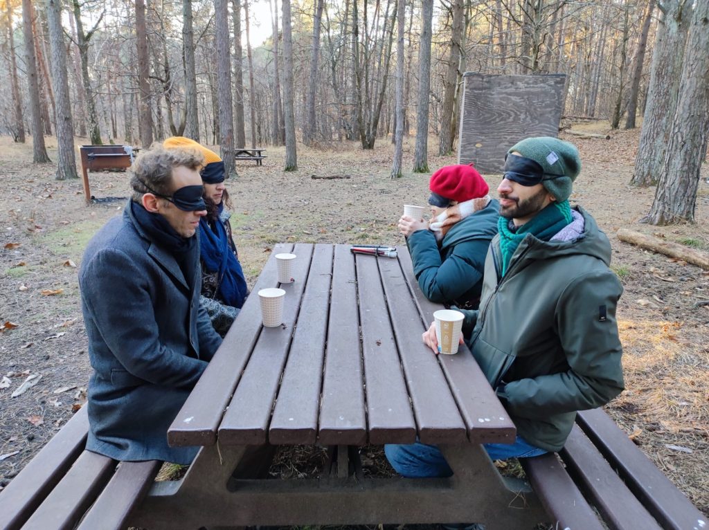 Al termine del percorso, ci siamo ritrovati attorno a un tavolo nel cuore del bosco per una degustazione. Bendati, anche questo momento è diventato un rito sensoriale: ogni sorso di tè caldo e ogni assaggio sono stati vissuti con un’intensità nuova. In questo spazio di condivisione sono emerse riflessioni profonde sulla socialità, sulle amicizie e sulle relazioni autentiche. Sentirsi parte di un gruppo, anche senza la vista, ha messo in luce quanto i sensi, se allenati, possano amplificare la percezione di ciò che ci circonda e di noi stessi.